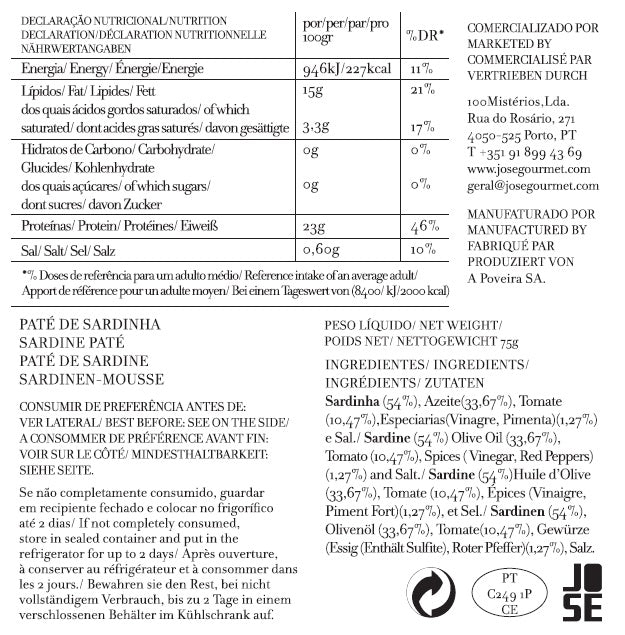 Hergestellt aus atlantischen und mediterranen Sardinen, enthält diese Pastete Zwiebeln, Knoblauch, Karotten und Gewürze, die eine aromatische, milde und köstliche Mischung bilden.