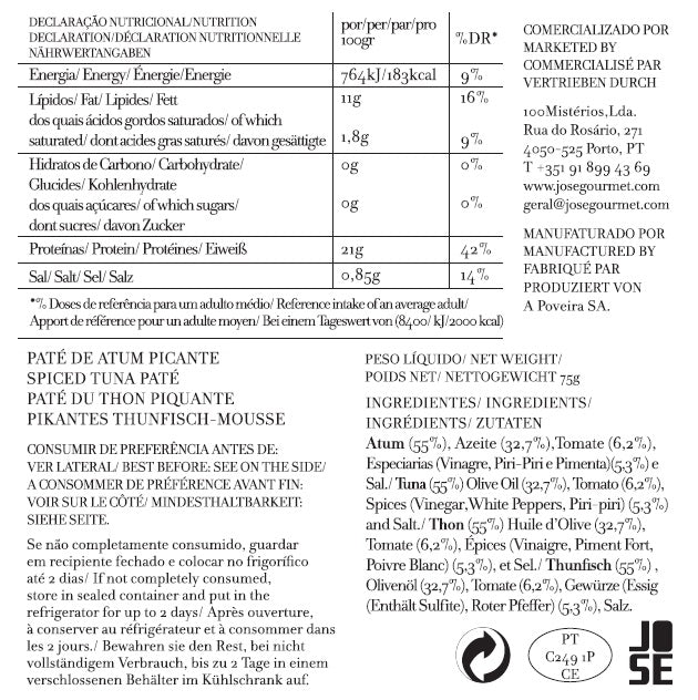 O Patê de Atum Picante JOSÉ GOURMET é uma versão mais condimentada do tradicional paté de atum. Ao condimento habitual dos nossos patés, azeite, tomate, vinagre e pimenta, juntamos neste caso o piri-piri. O aroma picante é suave e equilibrado com os restantes ingredientes.